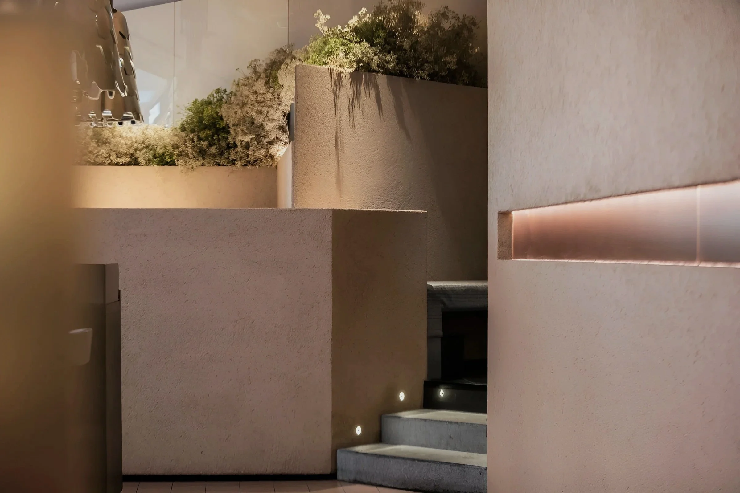 Here, that logic is reimagined through a tilted galvanized-steel canopy that echoes the Hanok’s distinct roofline. Inside, soil-tinted cement finishes soften the metallic edge, grounding the space in tactile warmth. A central atrium floods the interior with natural light, contrasting with its shadowed periphery to create a rhythm of openness and enclosure.
