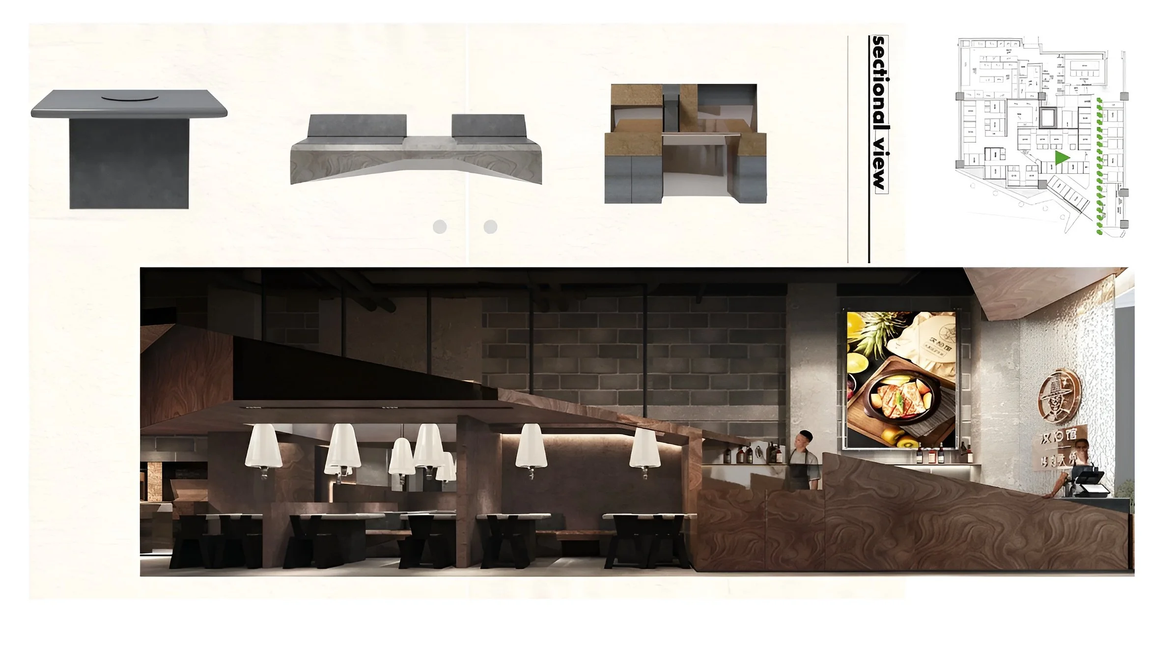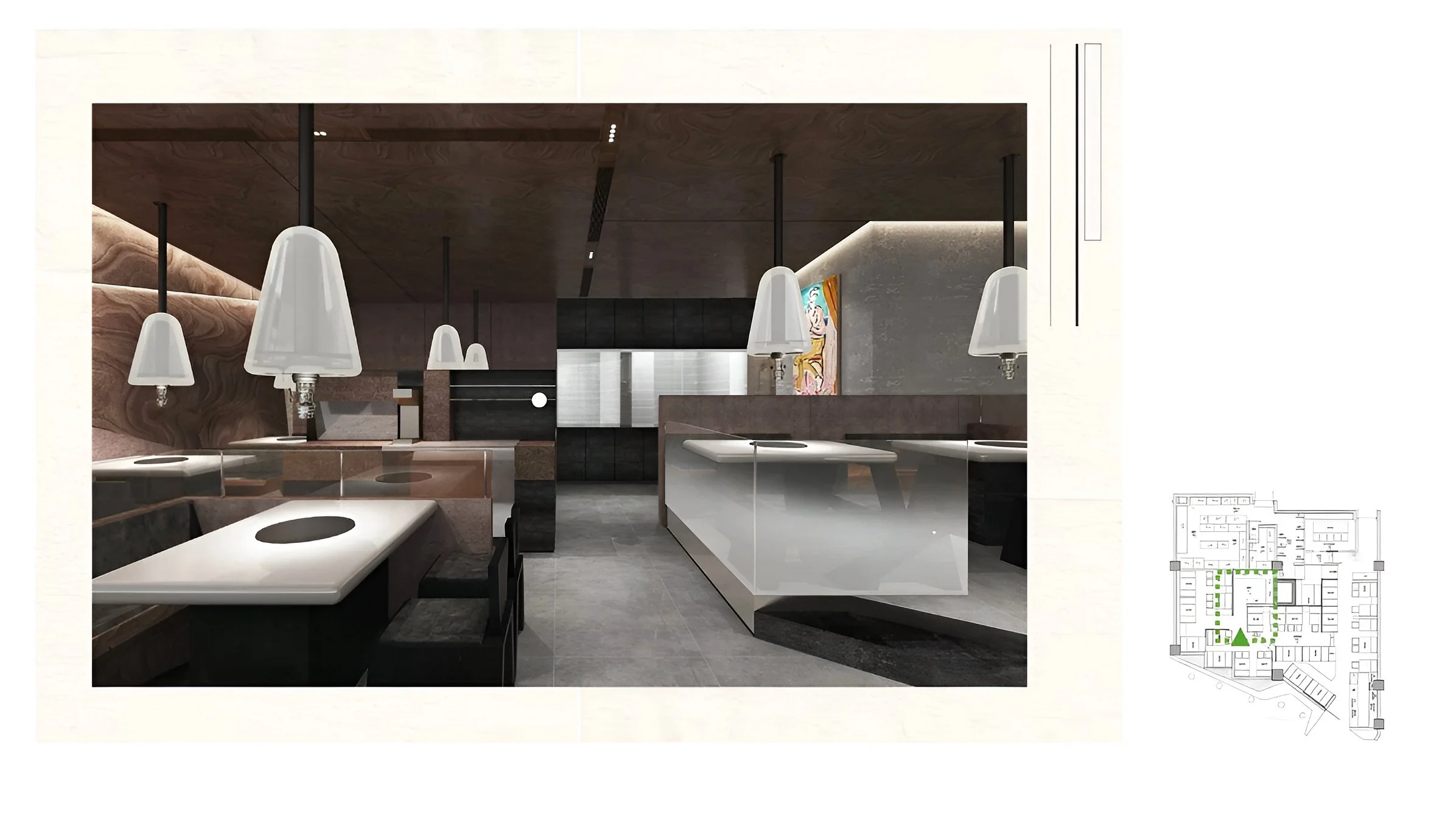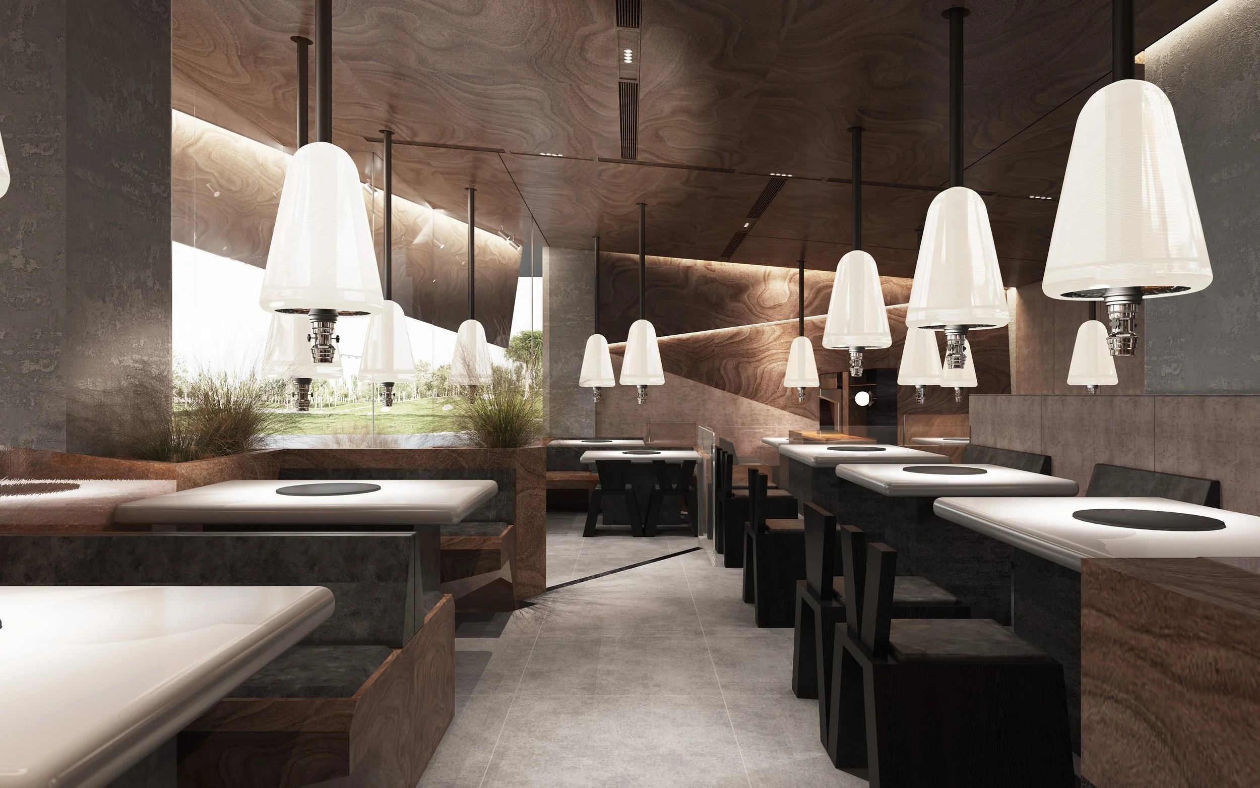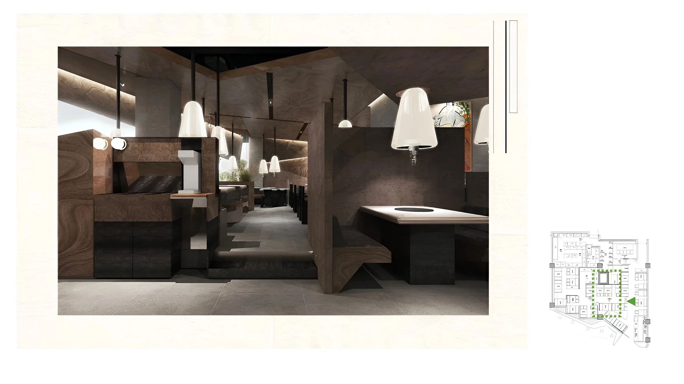 Located in Shanghai’s youthful MIXcity, this Hanyangguan branch captures the pulse of a new generation. The design plays with shifted volumes and dislocated gaps—creating a sense of movement and tension where space feels alive. This intentional “misalignment” mirrors the heat and rhythm of Korean barbeque itself: sparks, energy, and the joy of gathering in motion.
