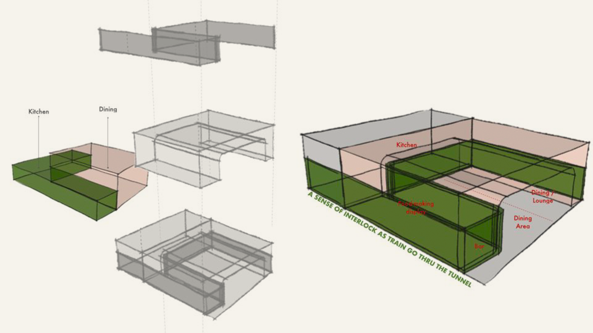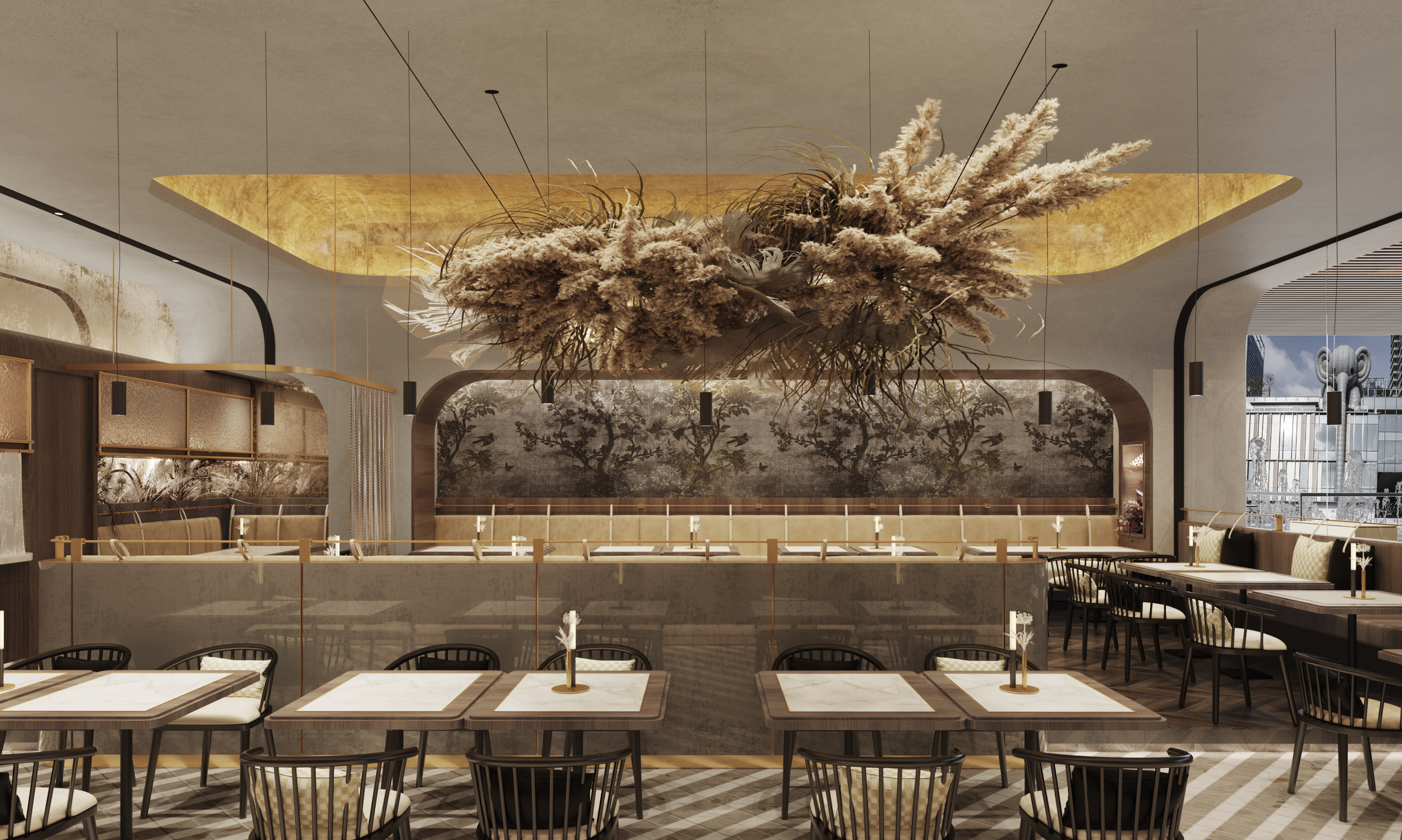 Architecturally, the space interlocks two contrasting worlds: a vintage train carriage seamlessly arriving at an Oriental station. This spatial fusion mirrors the restaurant’s culinary narrative—an encounter between East and West that unfolds as both spectacle and story.